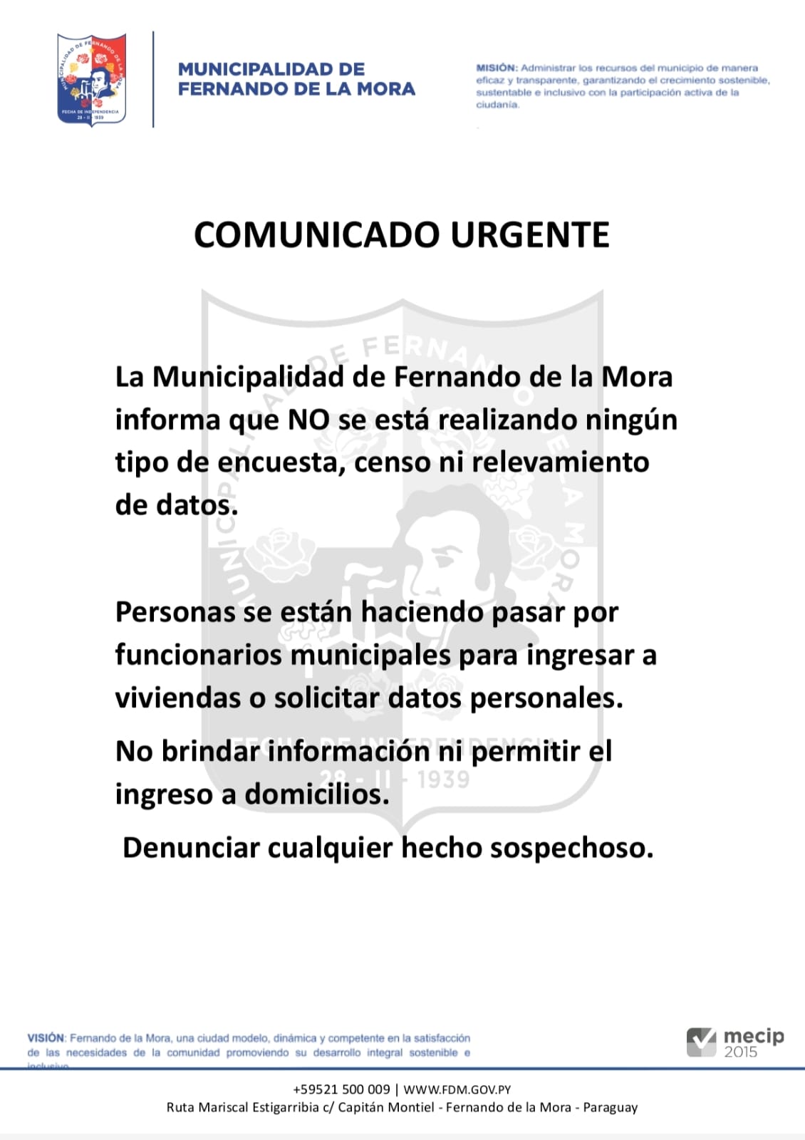 COMUNICADO URGENTE Ante denuncias recibidas, recordamos que la Municipalidad de Fernando de la Mora no está realizando encuestas ni censos en este momento.👉 Cualquier encuesta o censo oficial será comunicado exclusivamente por nuestras redes sociales y página web...